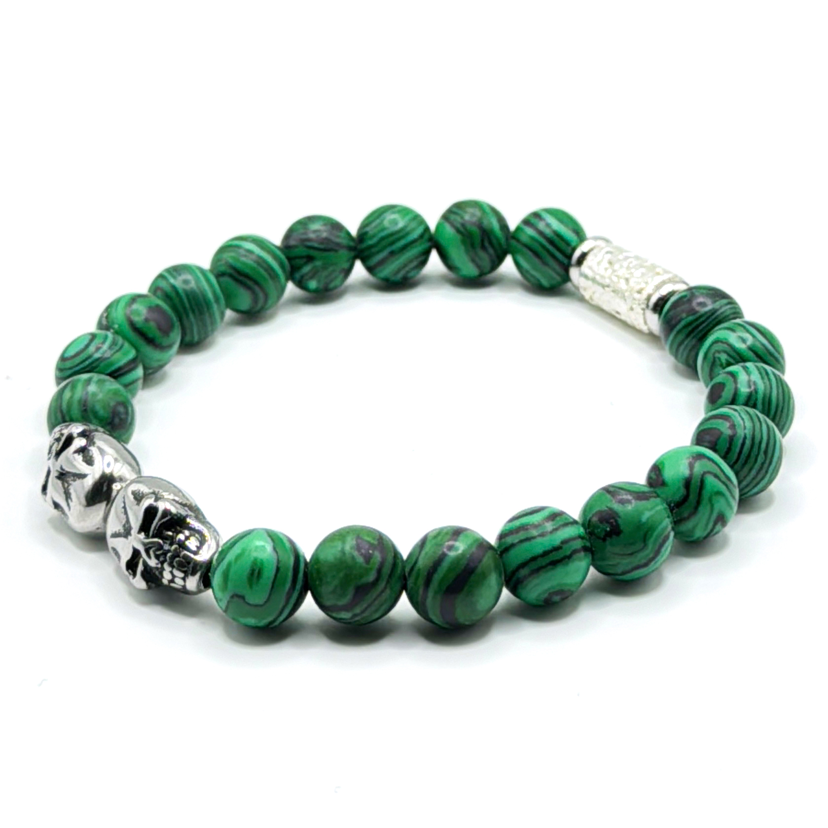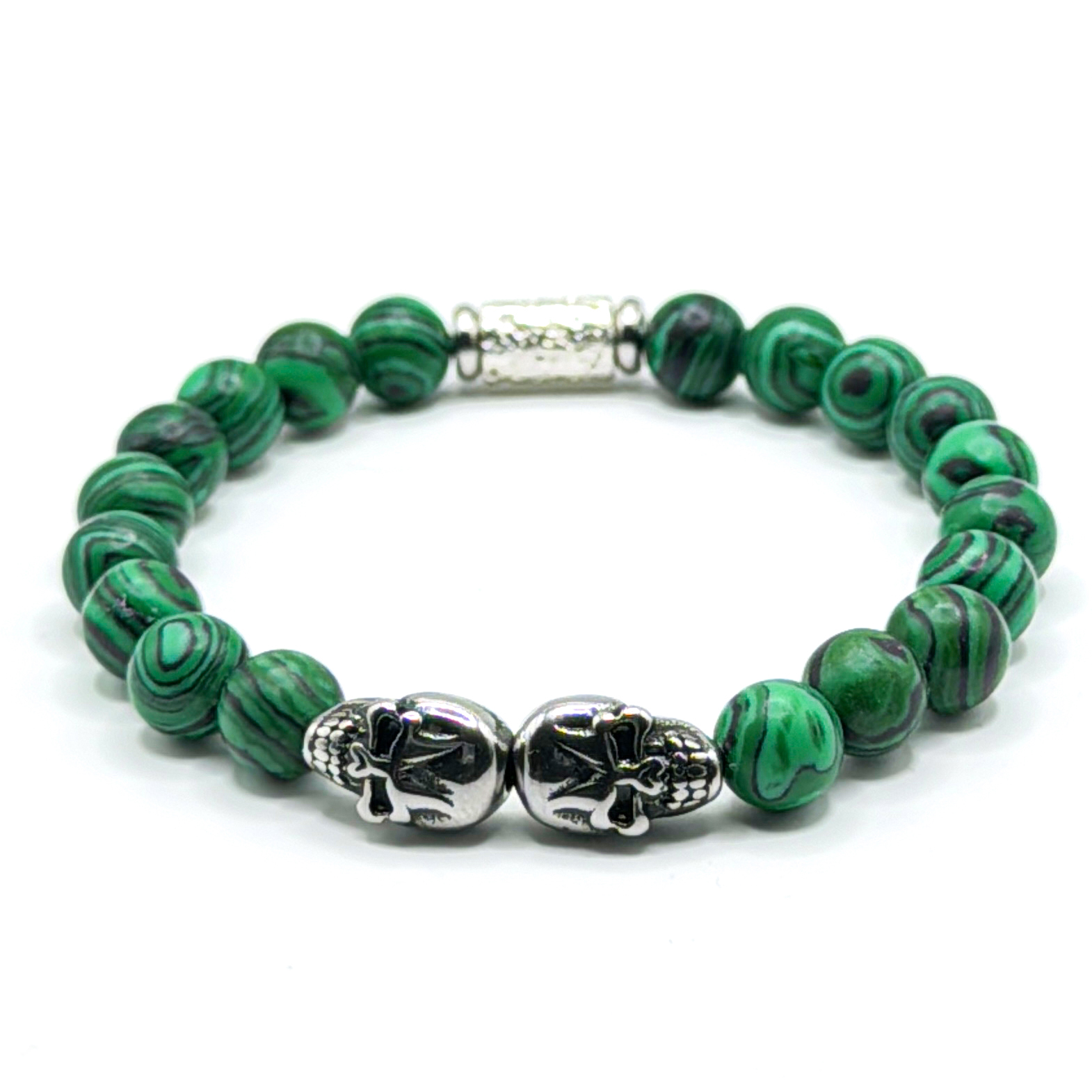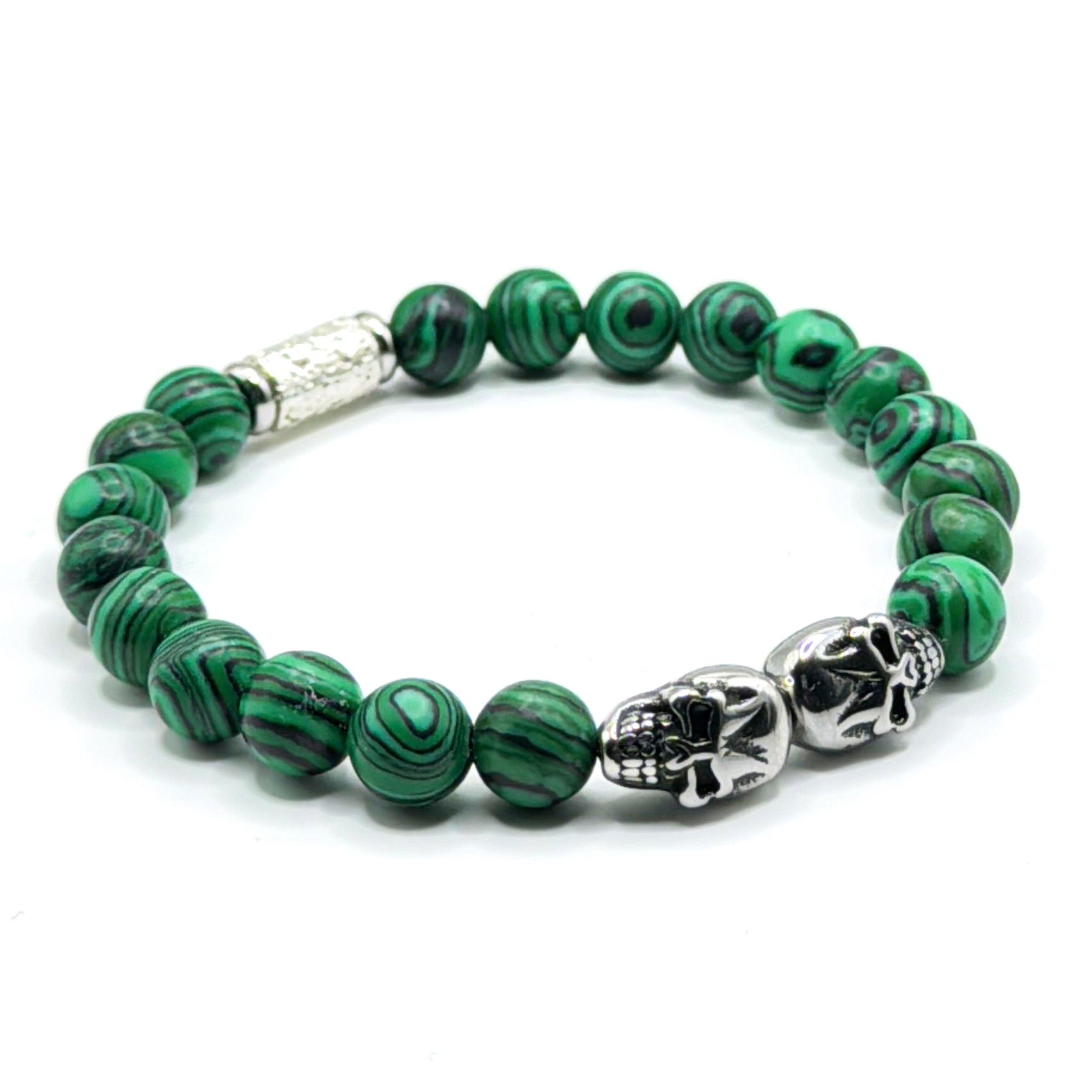 La colección Kranium Reptile combina malaquita verde jaspeada con piezas de acero inoxidable de calidad superior bañado en plata para ofrecer un acabado refinado y duradero. Esta joyería única es una opción perfecta para cualquier ocasión especial.